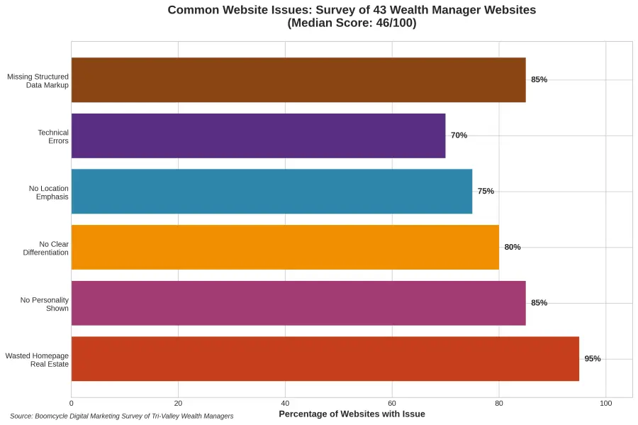 I actually did a deep-dive survey of 43 wealth manager websites in the “Tri-Valley”*, assessing technical SEO as well as presentation and engagement. The survey rated a website’s adherence to best practices, including proper use of titles and meta descriptions, H-tag usage, schema usage, etc.