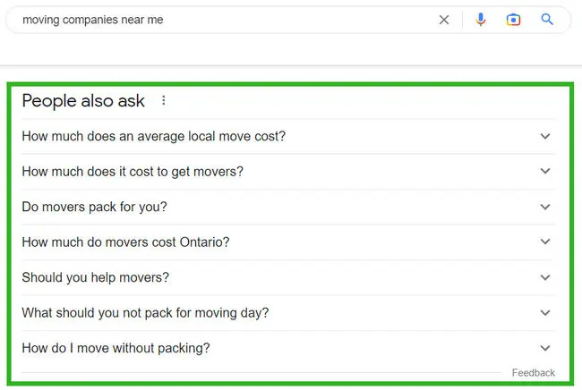 For example, when I search for “moving companies near me”, I get a map pack and the usual search results, but Google also shows their “People also ask” or PAA section, as shown in this example: