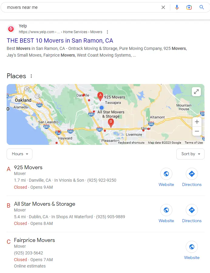 Another way to optimize your website for a moving company’s SEO is to create a Google Business Profile, or “GBP” (formerly “Google My Business” or “GMB” and you’ll still hear it referred to this old way in 90% of the internet). Your GBP is a free listing that appears in Google’s Local Business results.