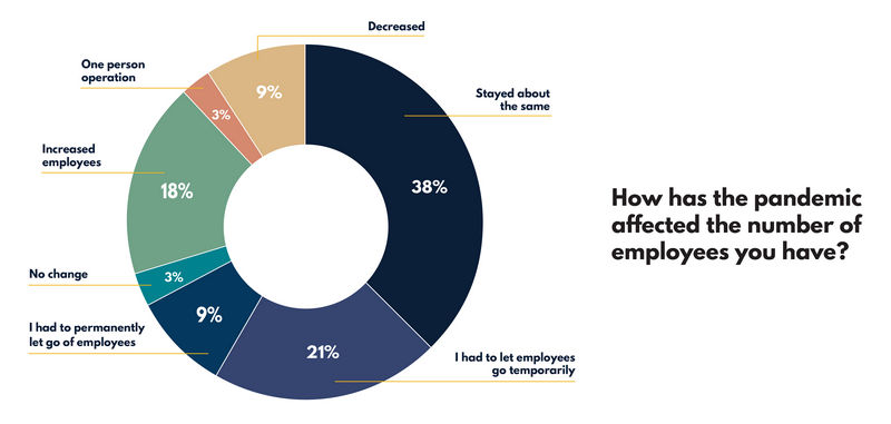 Hiring and employment stayed relatively steady, with 38% of respondents saying they kept all their employees, 21% let employees go temporarily, and 18% of business owners saying they’d actually hired even more employees.