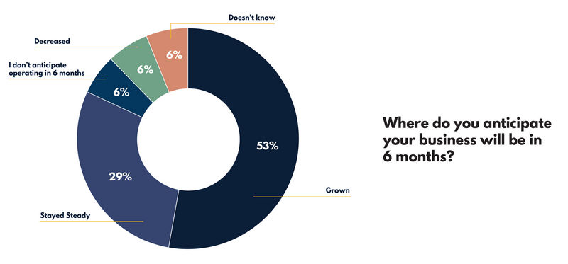 In fact, over half, 53% of the businesses surveyed expect their business to grow in the next six months. While no businesses surveyed had closed permanently as a result of the pandemic, 6% of the respondents guessed that their business would unfortunately close within six months.