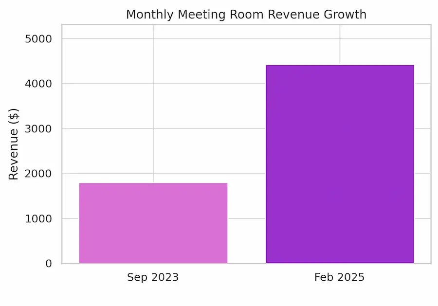 Perhaps most impressive was the explosion in meeting room utilization. Monthly conference room revenue skyrocketed 146.2%, climbing from $1,797.50 to $4,425.33.