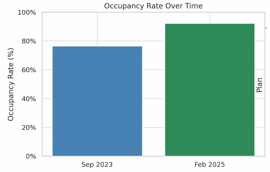Occupancy rate in September 2023 vs. February 2025, showing steady growth against massive market forces