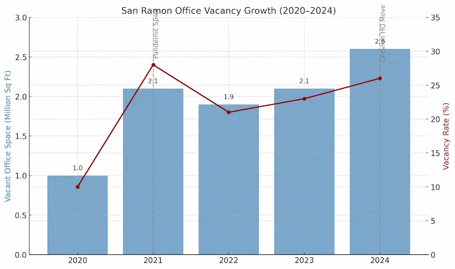 San Ramon’s office market collapsed when Chevron began relocating its headquarters to Houston in 2024, abandoning significant portions of Bishop Ranch’s 6 million square feet of commercial space.